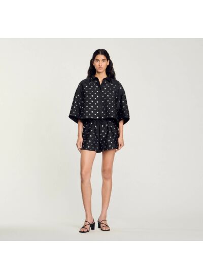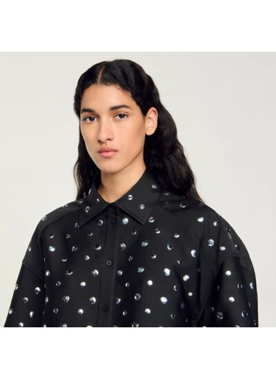 Chemise courte oversize munie de manches longues, d'une fermeture boutonnée, d'un col classique, et ornée de pastilles en métal argent.