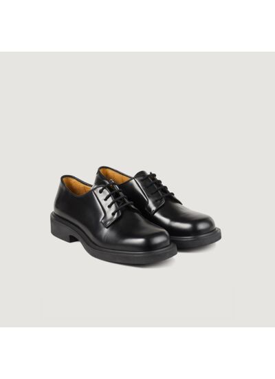 Derbies en cuir glacé entièrement doublées, munies de lacets ton sur ton, et d'une semelle monobloc en gomme ornée d'un logo SANDRO gravé au dos du talon.