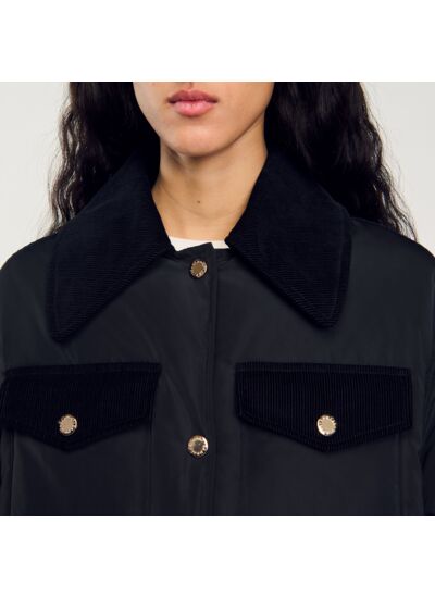 Doudoune courte munie de manches longues, d'une fermeture à boutons pression dorés et de poches sur les côtés, ornée d'empiècements en velours côtelé.