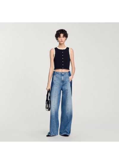 Gilet sans manches à col rond orné de fleurs crochetées et perlées, et d'une patte de boutonnage à boutons perles.
