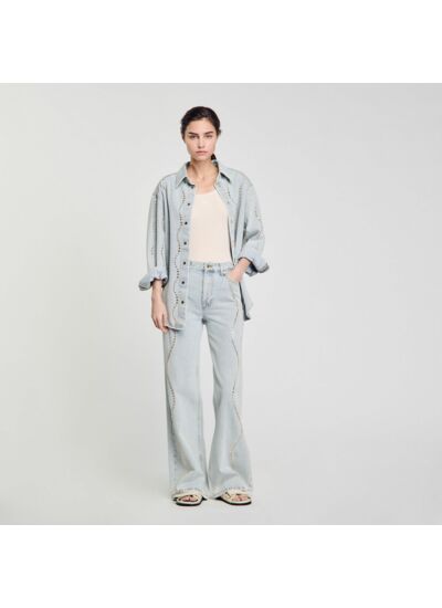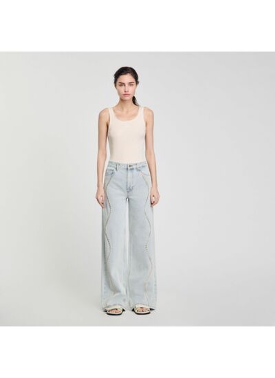 De quel matériau est composé ce jean Sandro ? Ce jean est conçu dans un denim de qualité, offrant confort et résistance, avec des bandes ornées de strass pour un effet mode affirmé sans compromettre la durabilité.