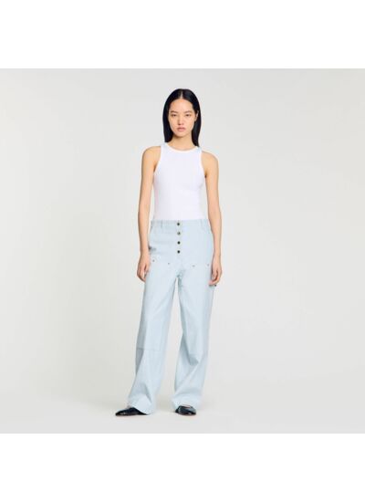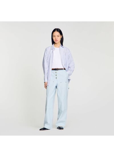 Quelle coupe propose ce jean Sandro ? Il présente une coupe carpenter, offrant une silhouette droite avec des détails fonctionnels qui renforcent son caractère utilitaire et tendance.