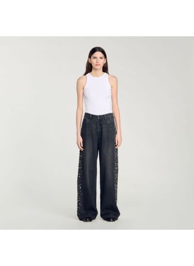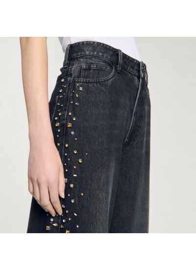 Jean large orné de strass sur les côtés, muni de 5 poches et de passants à la ceinture.
