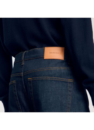 Jean regular en denim brut muni de poches et d'un jacron en cuir.