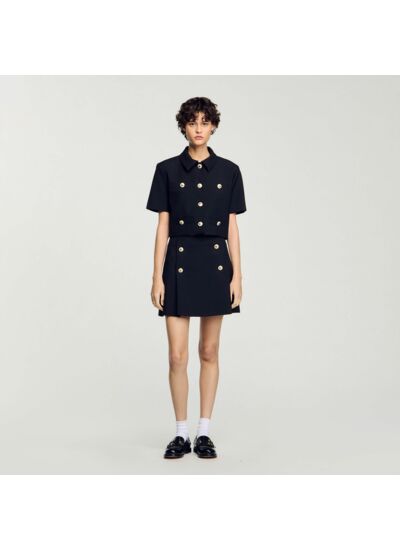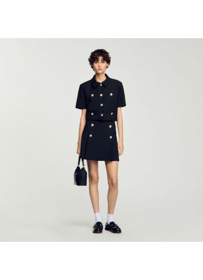 Jupe courte taille basse légèrement évasée à plis, ornée de boutons officier.