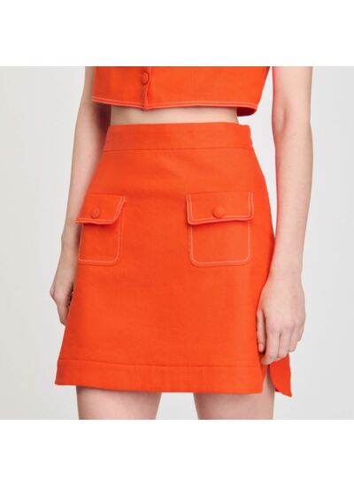 Jupe courte à surpiqûres contrastées et fentes arrondies, munie de poches à rabat et bouton.