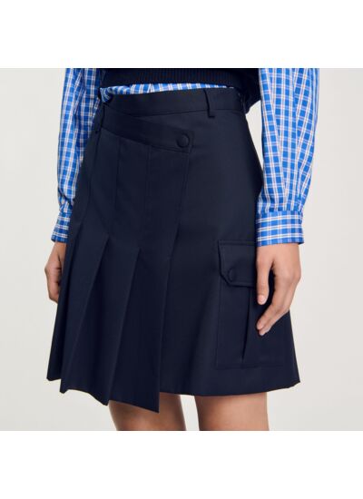 Jupe courte plissée à pan asymétrique à l'avant, munie de passants à la ceinture, d'un bouton pression et d'une poche cargo à rabat sur le côté.