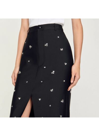 Jupe droite en soie mélangée munie d'une fente avant et ornée de strass al over.