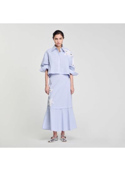 Jupe longue à rayures ornée de fleurs brodées perlées et strassées.