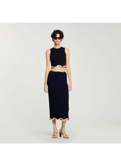 Jupe longue en maille ornée de finitions en chaînes droites à la ceinture et en vague sur le bas.