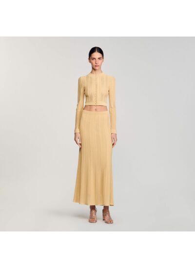 Quelle matière compose la jupe longue en maille pointelle Sandro ? La jupe est confectionnée en maille pointelle, offrant un équilibre parfait entre légèreté et texture raffinée, idéale pour un look élégant et confortable.