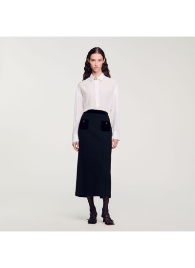 Avec quels vêtements associer cette jupe longue Sandro ? Elle se marie parfaitement avec un pull fin en laine, une blouse élégante ou un blazer structuré pour un look chic et moderne.