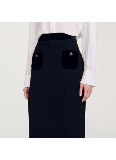 Jupe longue en tweed et velours munie de poches plaquées sur le devant et d'une fente au dos.