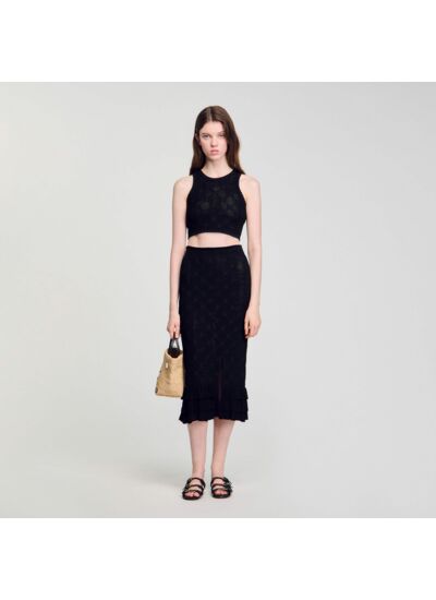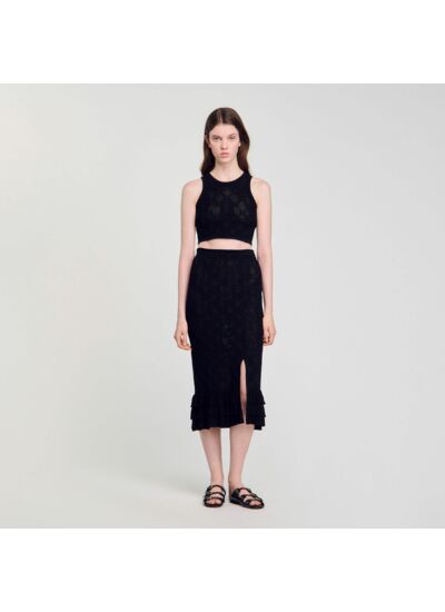 Jupe midi en maille fantaisie munie d'une fente à l'avant et de volants sur le bas.