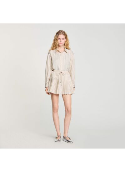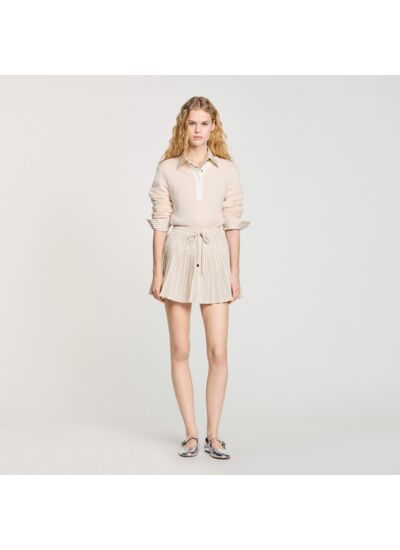 Jupe plissée à rayures ornée de strass, munie d'une taille élastiquée et de liens à nouer.