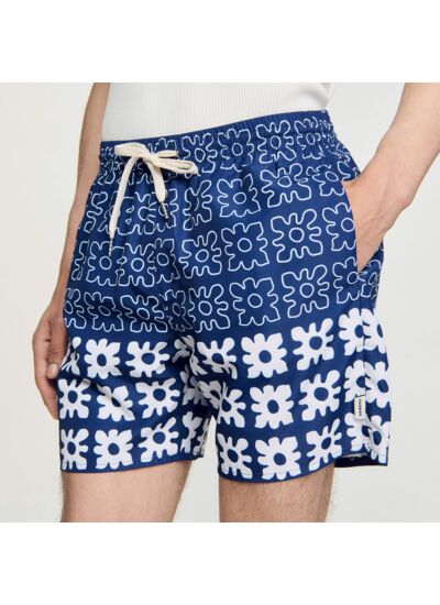 Maillot de bain à imprimé fleuri, muni d'une taille élastiquée à cordon, et de poches sur les côtés.