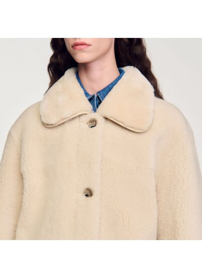 Manteau en peau lainée muni d'un col chemise, de manches longues et d'une fermeture boutonnée.