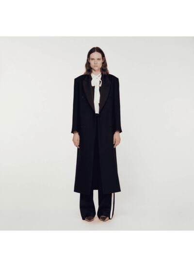 Manteau long à boutonnage croisé et col en satin à revers montant, muni de manches longues, de boutons recouverts et de poches passepoilées à la taille.