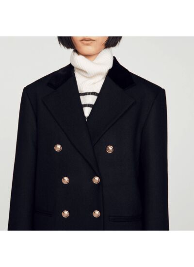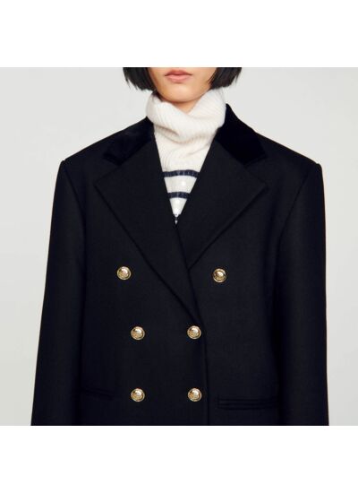 Manteau long à boutonnage croisé et large col tailleur à revers en velours, muni de poches passepoilées.