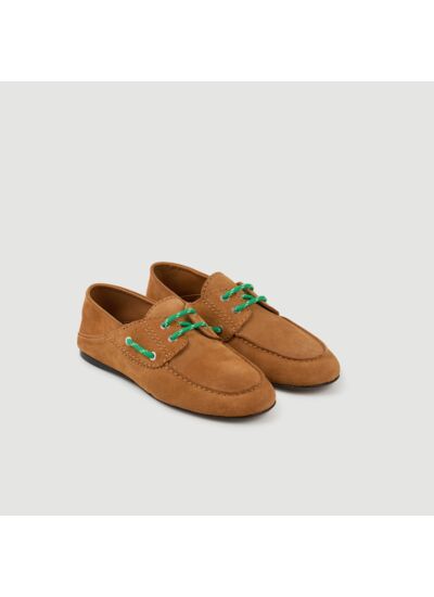 Mocassins bateau en cuir suède munis de lacets fantaisie et d'un contrefort pliable offrant un porté en mules.