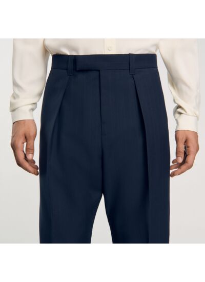 Pantalon de costume rayé à plis creux sur le devant, muni de poches sur les côtés.