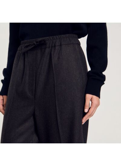 Pantalon de costume large à fines rayures, muni d'une taille élastiquée avec cordons à nouer et de poches italiennes sur les cotés.