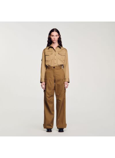 Pantalon droit à poches cargo sur les côtés, muni de passants à la ceinture.
