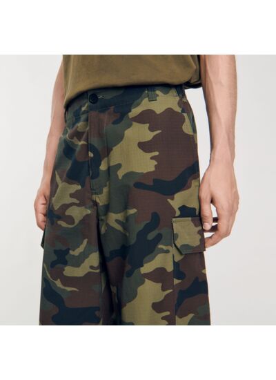 Pantalon cargo à multiples poches, muni de passants à la ceinture et orné d'un imprimé camouflage.