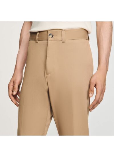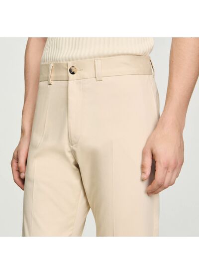 Pantalon chino à coupe droite en toile de coton, muni d'un pli marqué, de passants ceinture, d'une fermeture zippée à boutons et de poches sur les côtés.