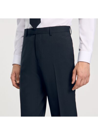 Pantalon de costume à fines rayures, muni d'une fermeture zippée à crochet, et de poches sur les côtés.