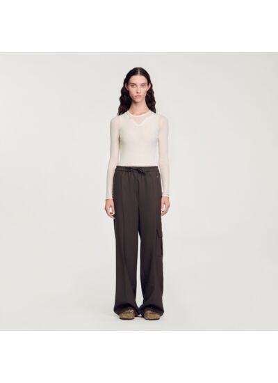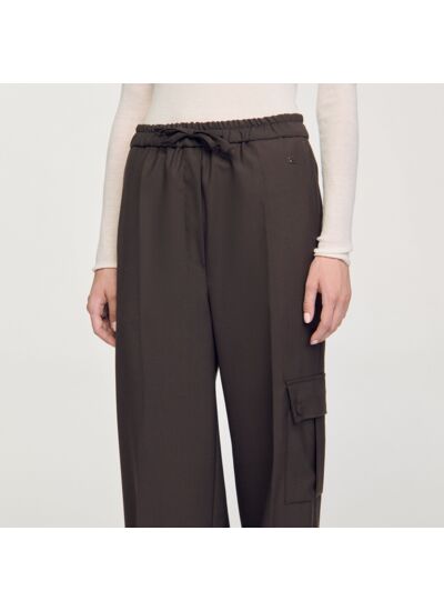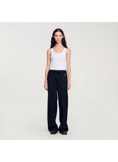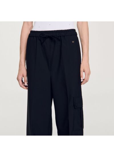 Pantalon large muni d'une ceinture élastiquée à la taille avec cordons de serrage, de poches sur les cotés, et d'une poche à rabat sur le côté.