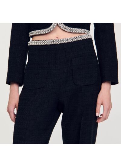 Pantalon en tweed à jambes évasées, muni d'une taille haute ornée de perles.
