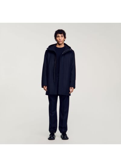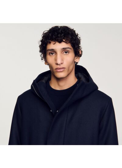Parka en laine rembourrée et paddée, munie d'une capuche, d'une fermeture zippée à patte recouverte, et de manches longues.