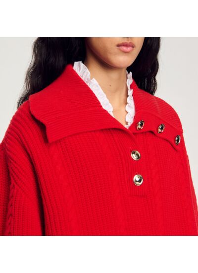 Pull en maille épaisse côtelée et torsadée, muni d'un large col vareuse à boutons dorés, de manches longues à poignets resserés.