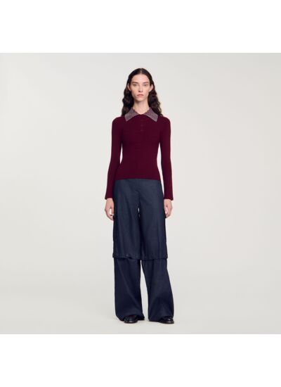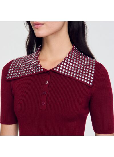 Pull en maille côtelée muni de manches courtes et d'un col vareuse à boutons orné de pastilles en métal.