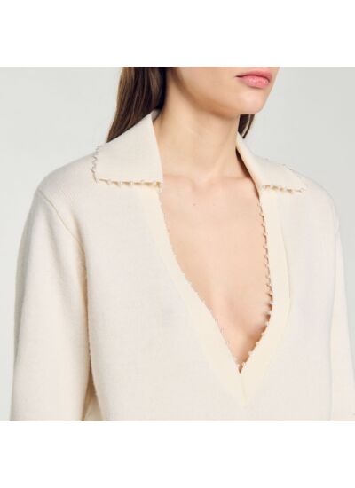 Pull en maille côtelée muni d'un col polo ouvert en V orné de petites perles, et de manches longues.