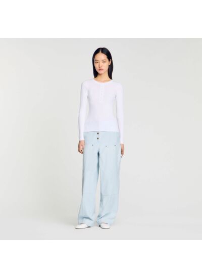 Pull en maille côtelée à col tunisien boutonné et manches longues.