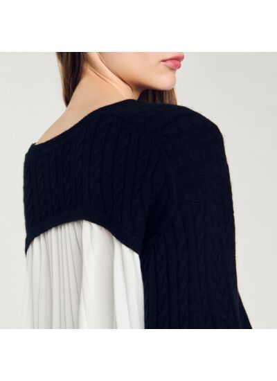 Pull court en maille torsadée mélangée composée de laine et de cachemire, muni d'un col rond, de manches longues et d'un dos plissé contrasté.