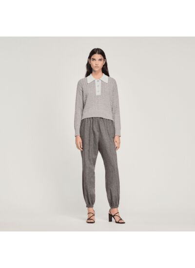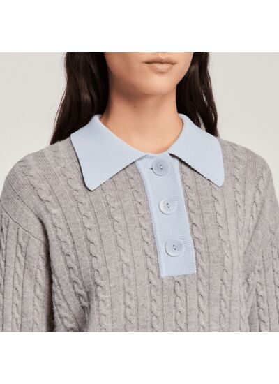 Pull court en maille câble torsadée, muni d'un col polo contrasté à 3 boutons et de manches longues.