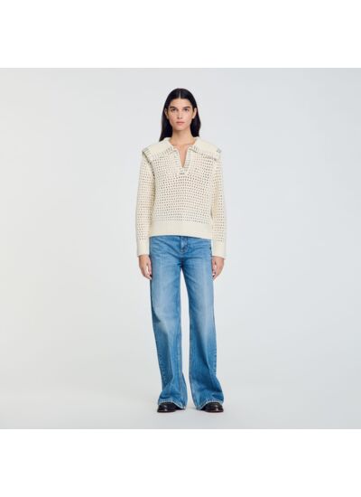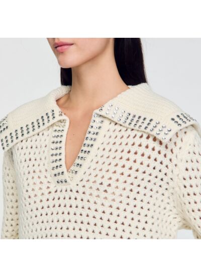 Pull en maille pointelle ajourée muni d'un col vareuse en V orné de strass, de manches longues et de finitions côtelées.