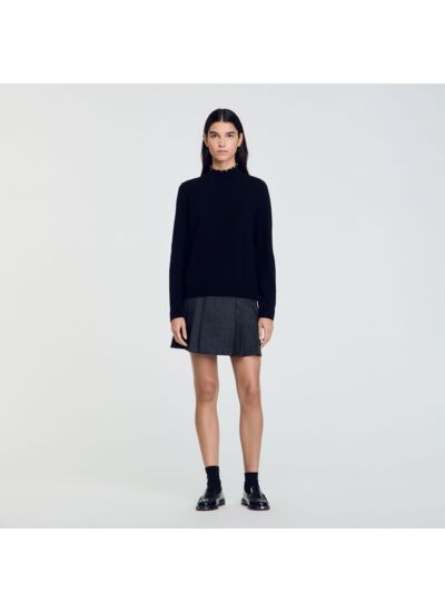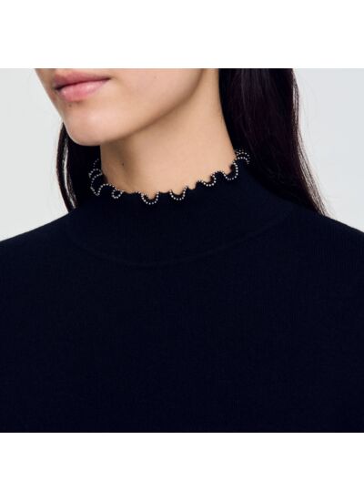 Pull en maille cotelée composée de laine et de cachemire, muni d'un col montant à finition volantée orné de mini perles argentées, et de manches longues.