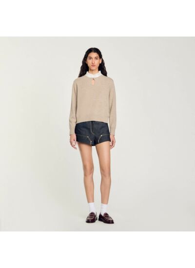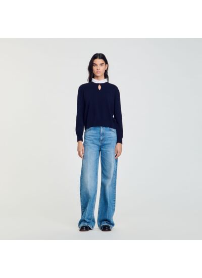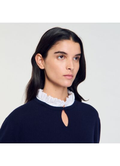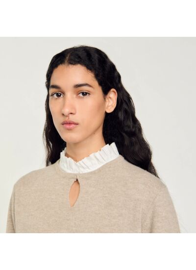 Pull en maille laine et cachemire muni d'un col amovible contrasté à volants, d'une ouverture en goutte sur le devant et de manches longues.
