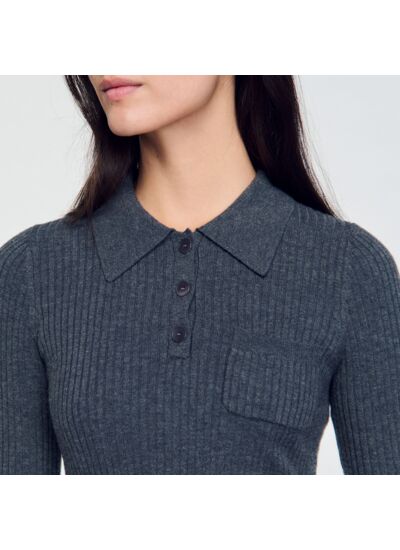 Pull en maille côtelée effet chiné muni d'un col polo à boutons, de manches longues et d'une poche plaquée à la poitrine.
