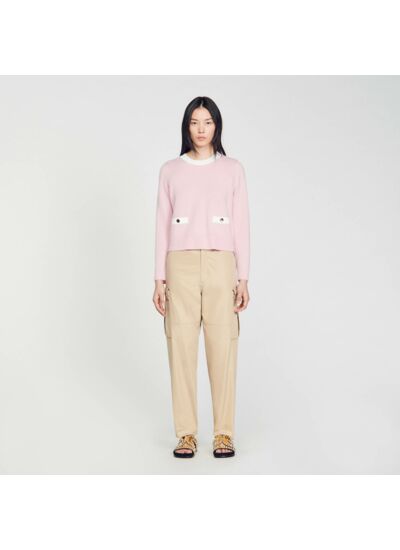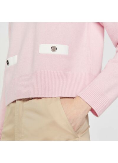 Pull en maille fine muni d'un col rond, de poches et d'une patte de boutonnage au dos contrastés.
