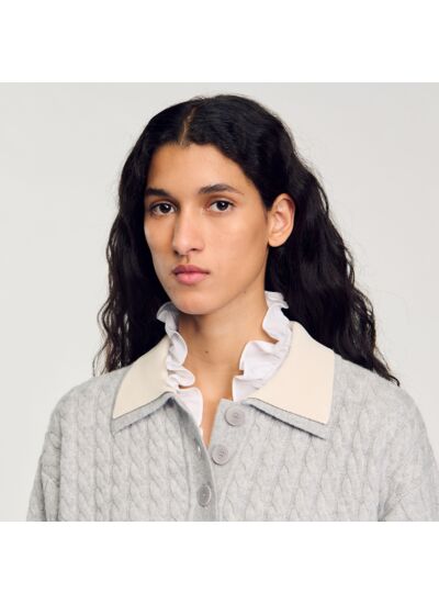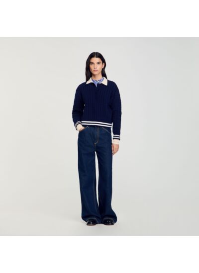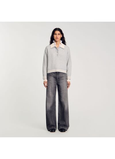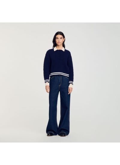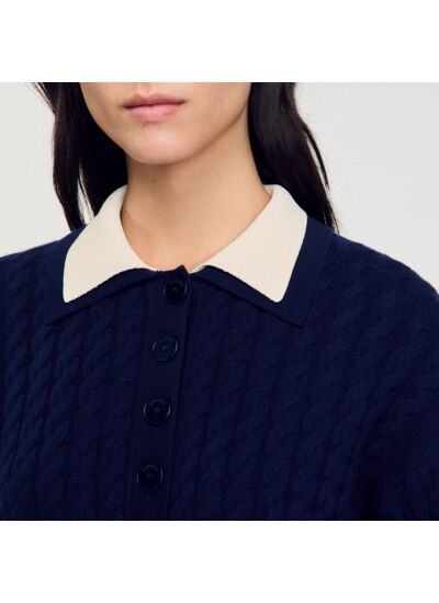 Pull en maille torsadée en laine et cachemire, muni d'un col polo contrasté à boutons, de manches longues, et orné de bandes aux poignets et à la taille.