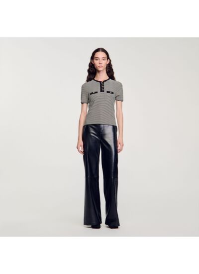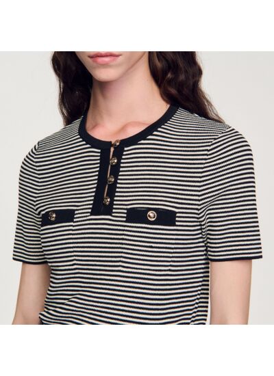 Pull à col rond et manches courtes en maille rayée, muni d'une encolure à boutons et de poches plaquées à la poitrine.