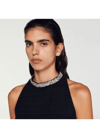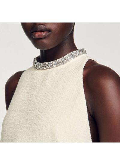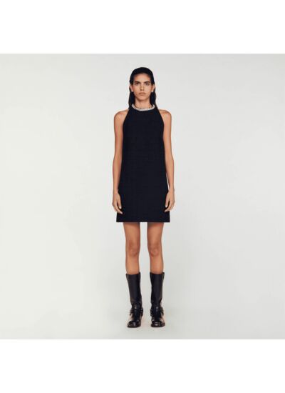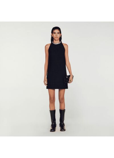 Robe courte en tweed à emmanchures américaines, munie d'un col rond orné de bijoux.