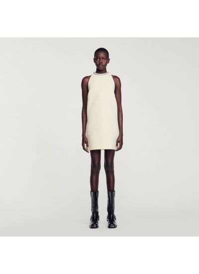 Comment entretenir la robe Sandro SFPRO03312 ? Pour préserver la qualité des matériaux et l’éclat du col bijoux, il est recommandé de suivre les instructions d’entretien indiquées sur l’étiquette, généralement un nettoyage à sec professionnel.