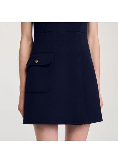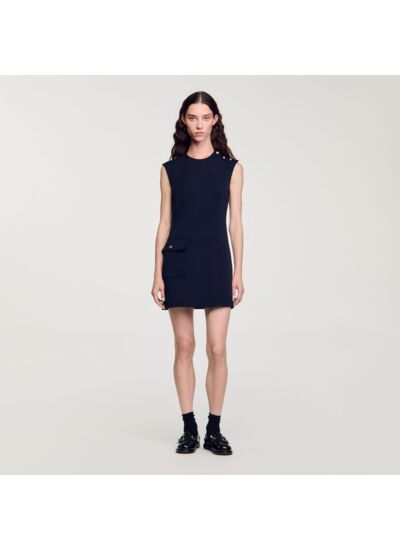 Robe courte sans manches en crêpe lourd munie d'un col rond, d'une large poche plaquée avec rabat, d'une fente à la jupe et ornée de boutons à l'épaule.