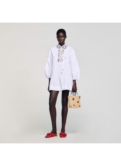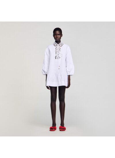 Robe courte en popeline plissée à manches longues et encolure en V ornée de dentelle.